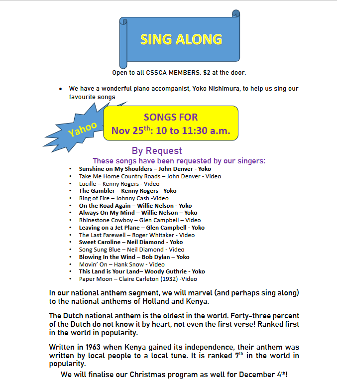We meet at 10 a.m. on the second or third Tuesday of the month. We continue to enjoy the Centre’s sound-projection system as we sing the songs we all love to sing in the shower!