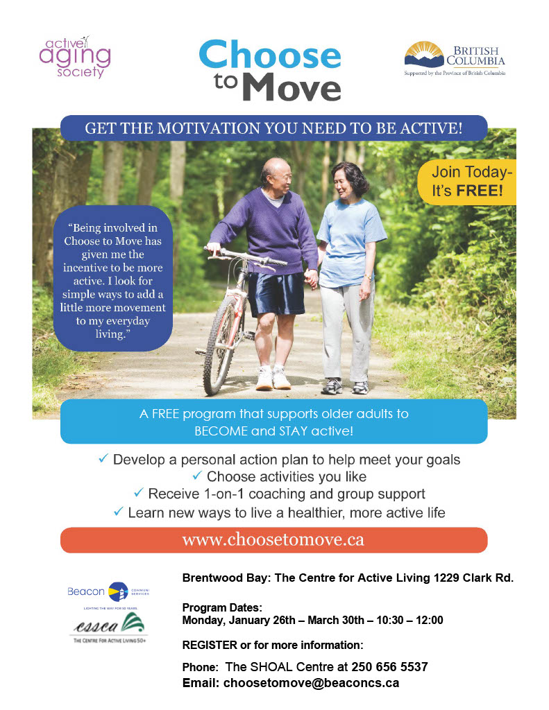 Being active can help you feel better, be stronger, and keep your independence. The Centre for Active Living has partnered with Beacon Community Services, SHOAL Centre to offer Choose to Move, a FREE 10-week program that uses a science-based approach to support