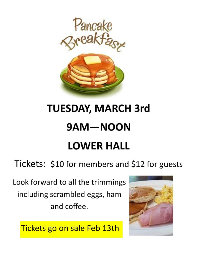 Pancake Breakfast Tues. March 3rd 9am-12pm – tickets on sale Feb. 13th